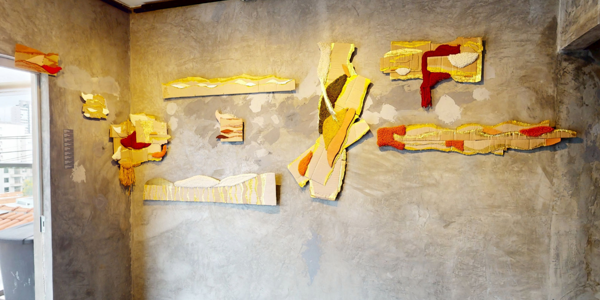 Os bordados representam as mulheres da sua família, memórias afetivas fundamentais da sua infância. O dourado e o papelão, em sua união, formam algo novo, materializando como o externo afeta o interno, assim como as expectativas alheias invariavelmente nos afetam. A cerâmica aterra a mente, acalmando e assentando o que, de outra forma, pode escapar-lhe do controle e das mãos.