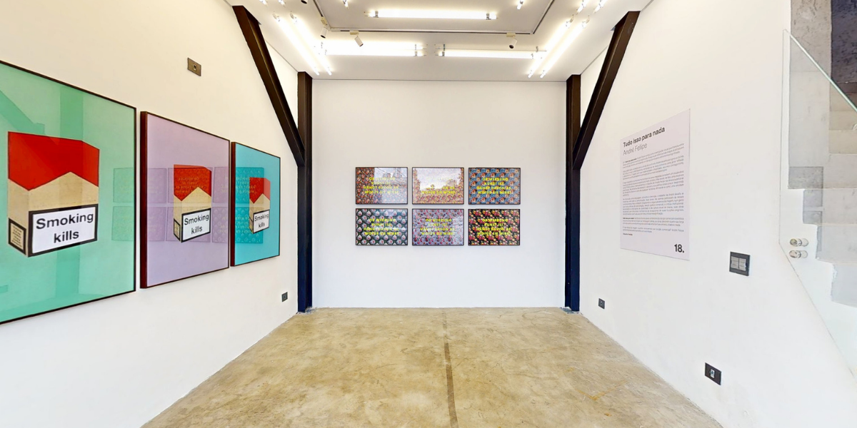 Em Tudo isso para nada, André Felipe conduz uma investigação visual que transita entre design gráfico, arte conceitual e abstração. A exposição reflete a maturidade do artista em sua produção recente, promovendo um diálogo provocativo entre forma e significado.